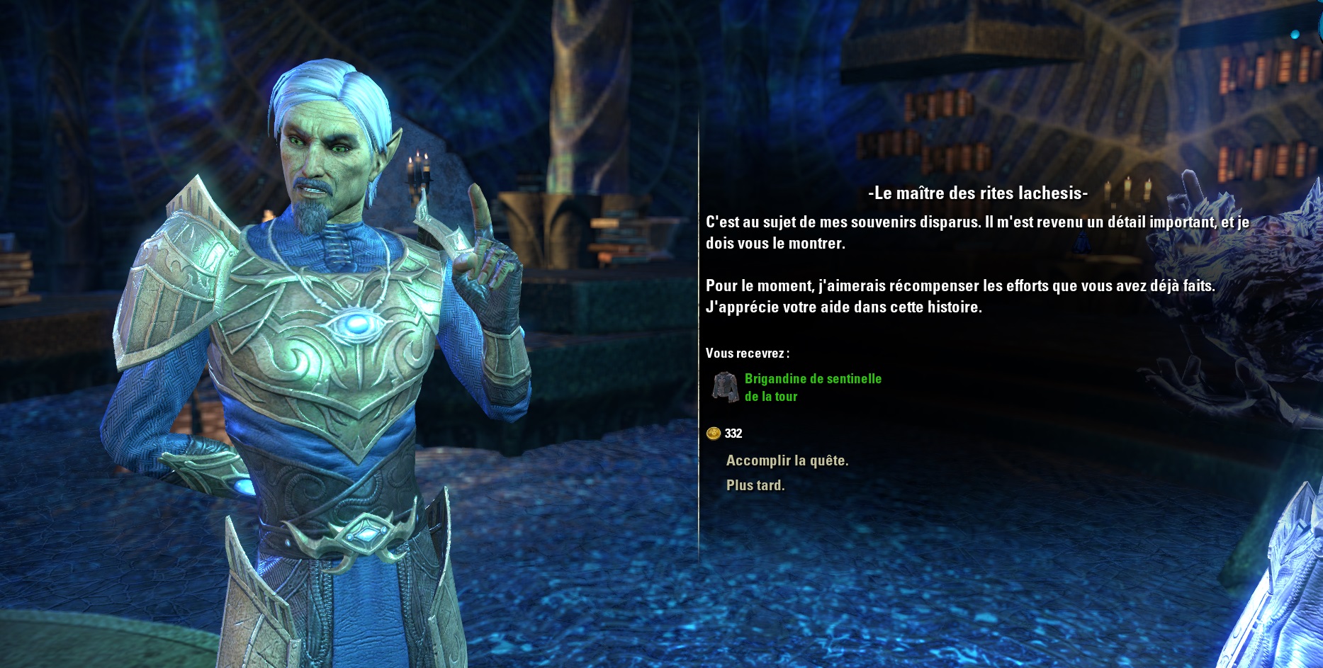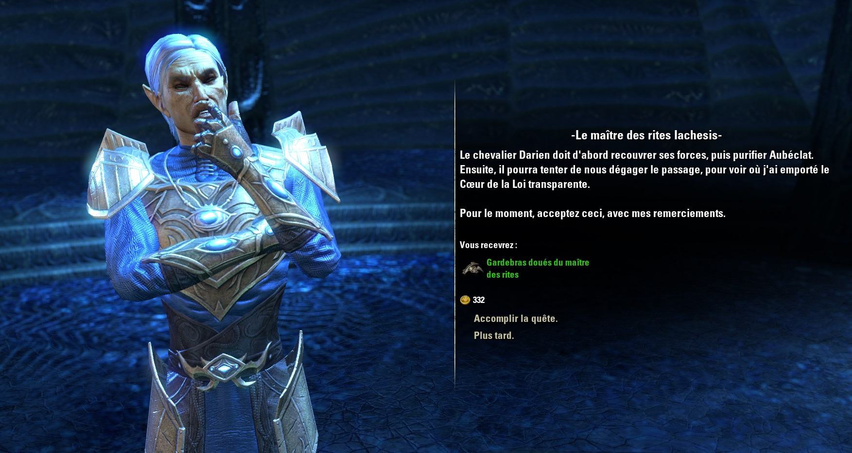 Le Sload des mers a modifié les souvenirs du maîtres des rites pour qu’ils volent le cœur de la loi transparente et le cache. Rendez-vous à Alinor pour demander l’autorisation d’accéder au collège des Sapiarques.