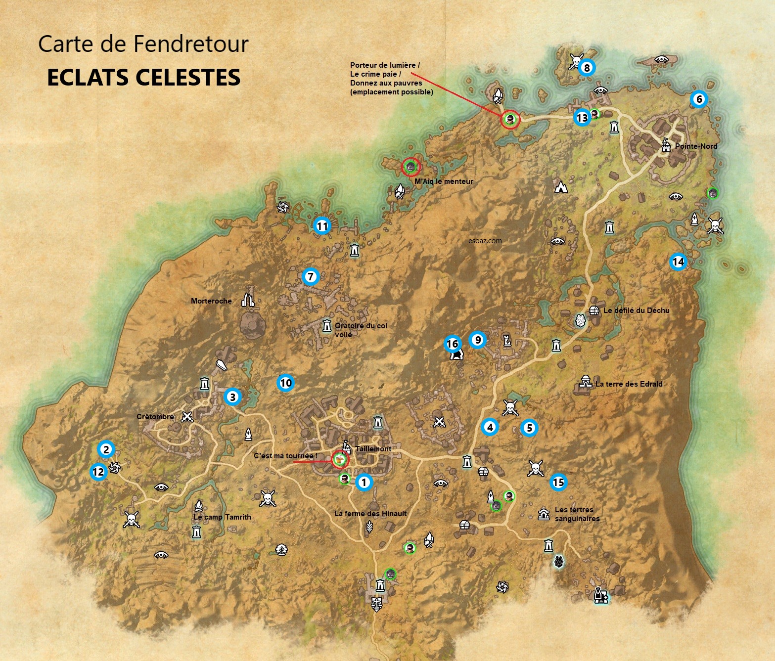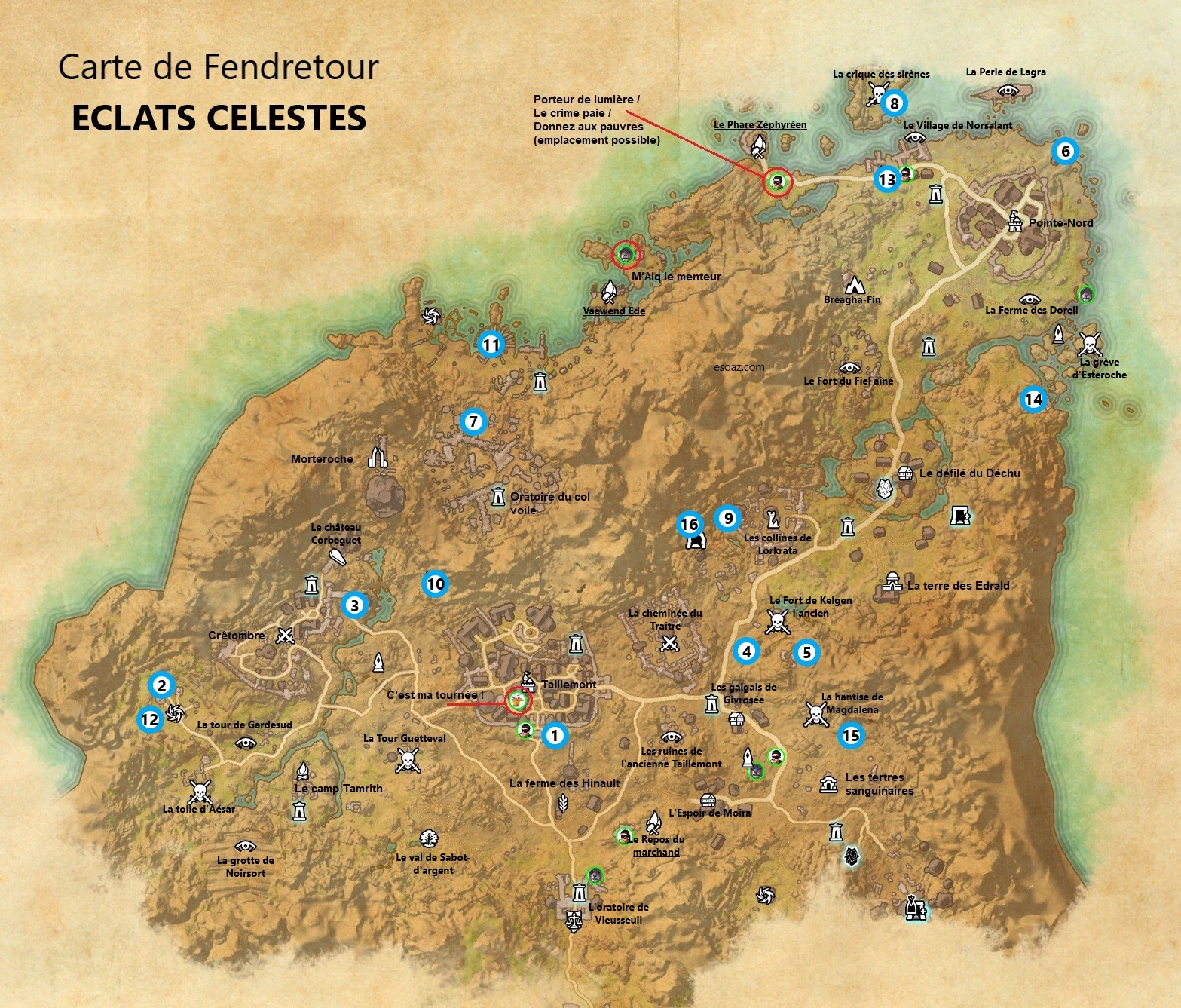Vous trouverez sur la carte ci-dessous, les emplacements des succès d’exploration tels que porteur de lumière, c’est ma tournée etc … les éclats célestes ainsi que tous les lieux visitables de la carte.