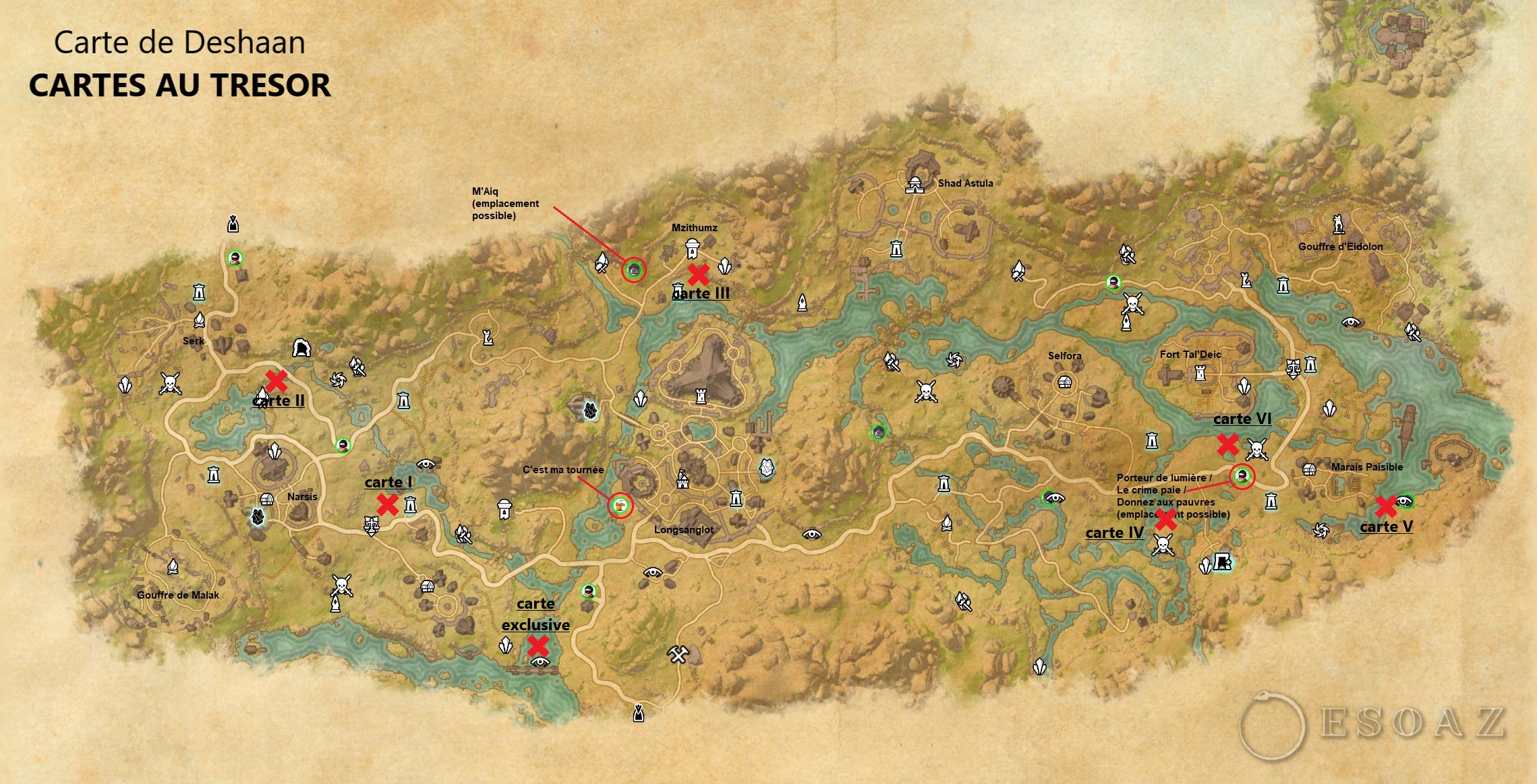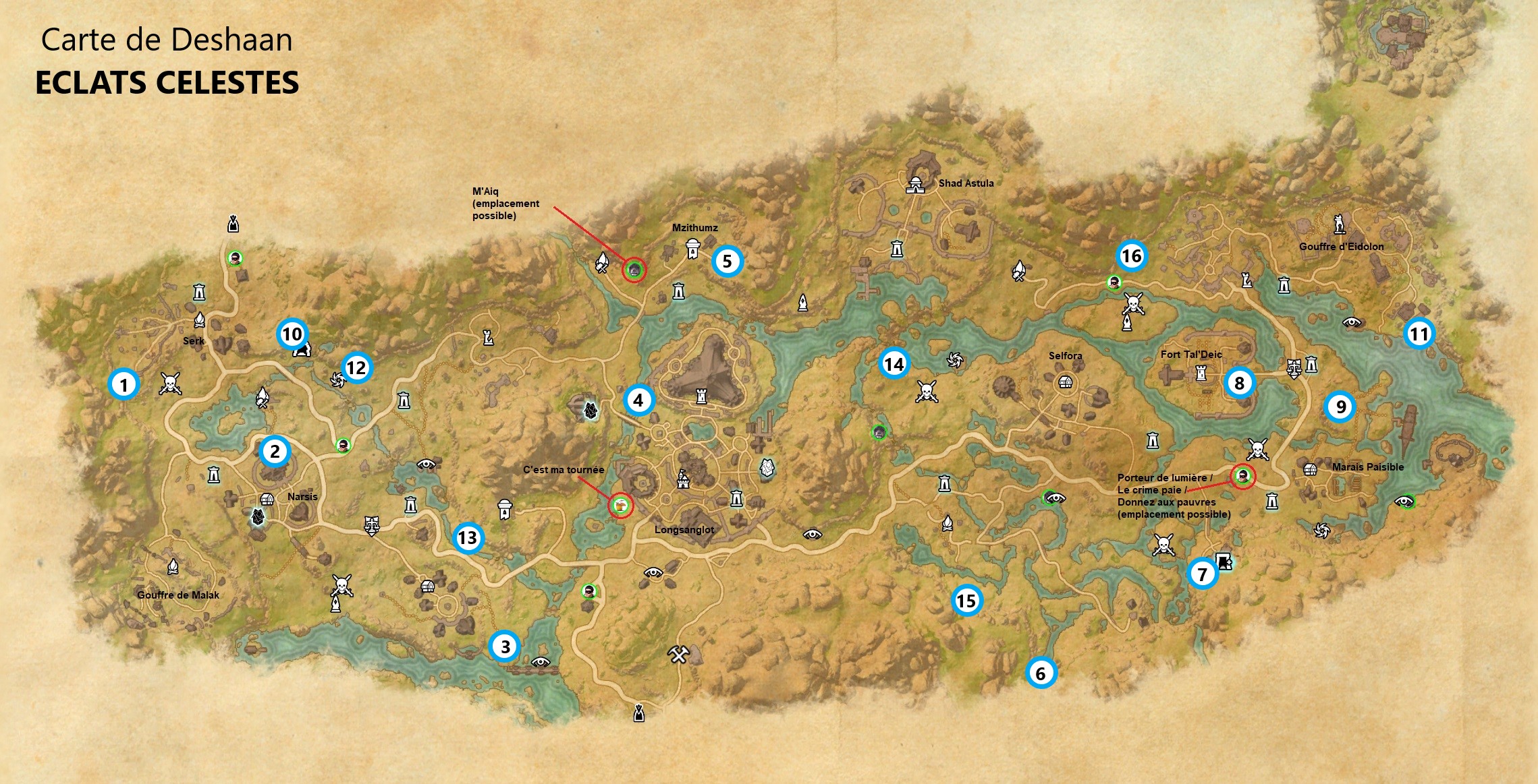 Vous trouverez sur la carte ci-dessous, les emplacements des succès d’exploration tels que porteur de lumière, c’est ma tournée etc … les éclats célestes ainsi que tous les lieux visitables de la carte.