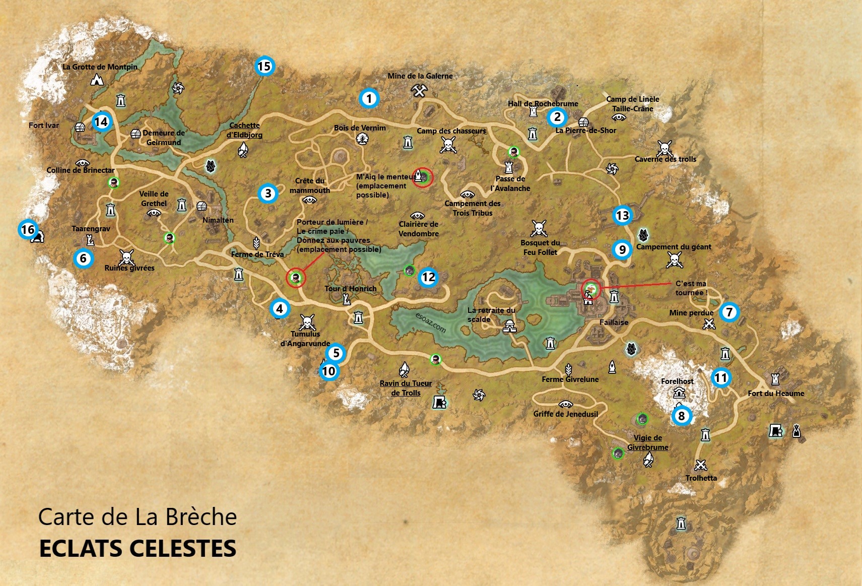 Vous trouverez sur la carte ci-dessous, les emplacements des succès d’exploration tels que porteur de lumière, c’est ma tournée etc … les éclats célestes ainsi que tous les lieux visitables de la carte.
