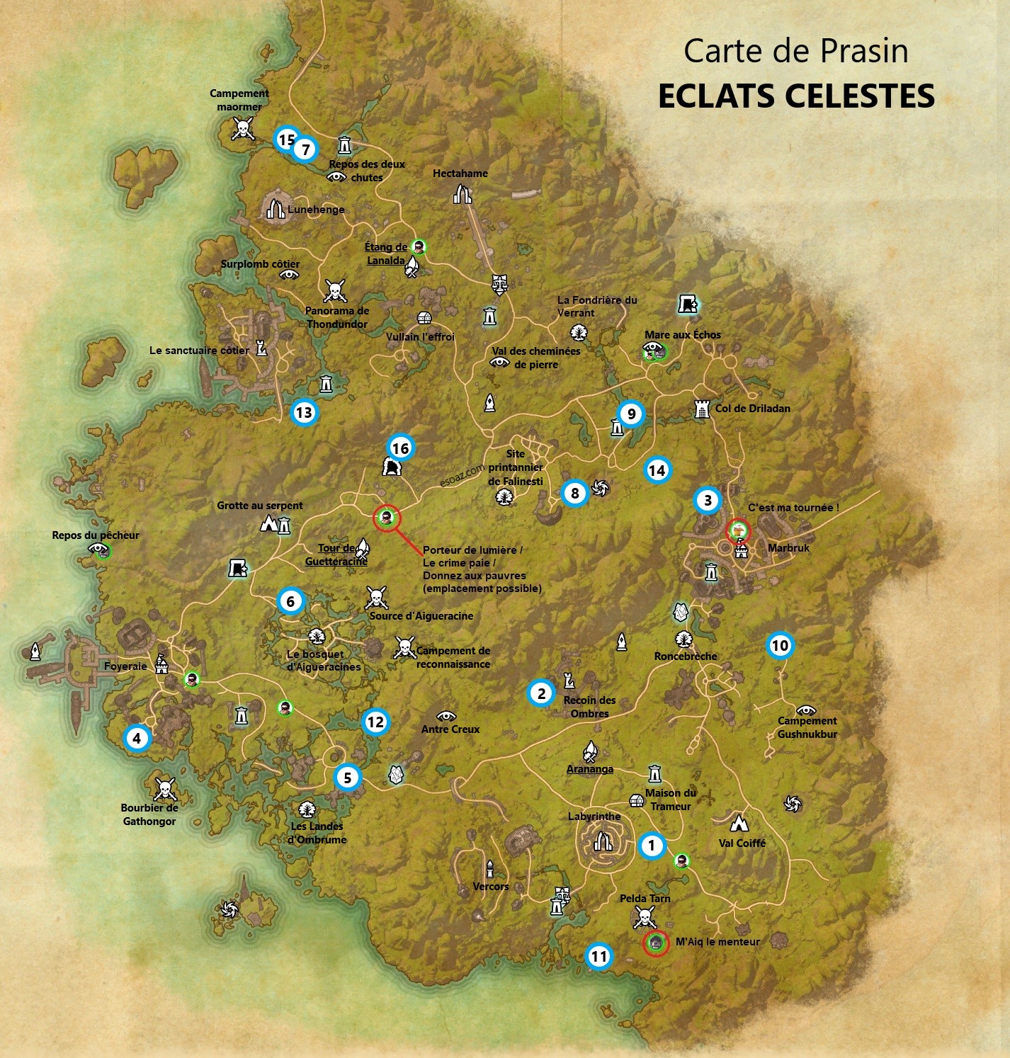 Cartes de Prasin. Emplacements de tous les éclats célestes de la zone. Cartes au trésor et livres des mages !