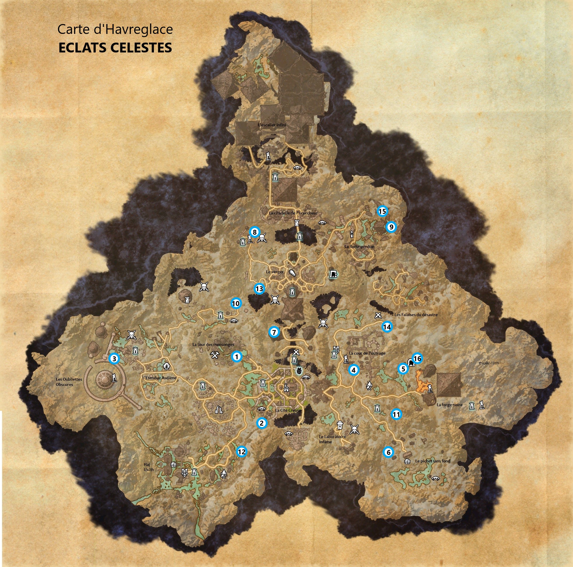 Cartes de Havreglace. Emplacements de tous les éclats célestes de la zone. Cartes au trésor et livres des mages !