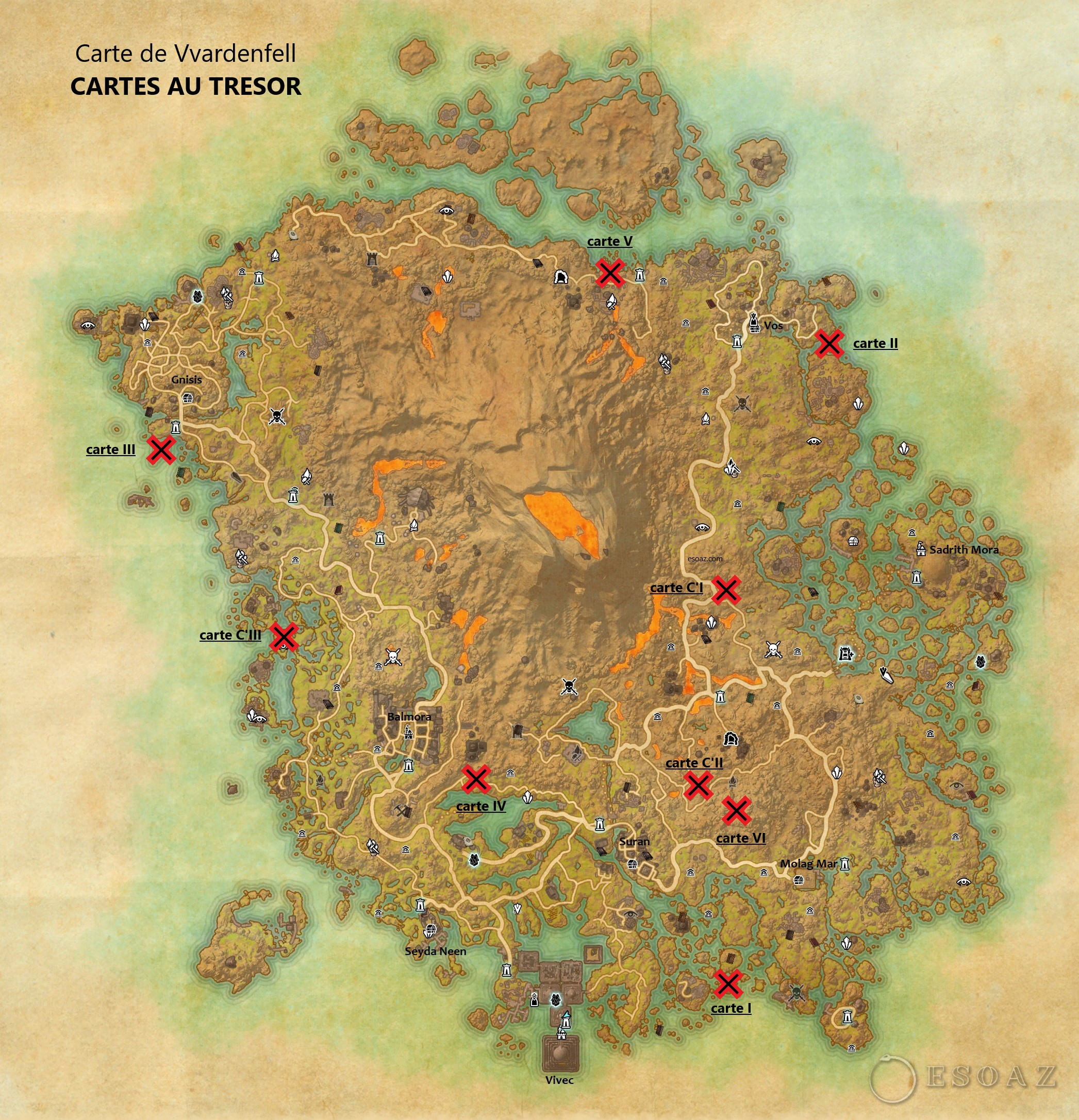 Carte de Vvardenfell. Emplacements de tous les éclats célestes de la zone. Cartes au trésor et livres des mages !