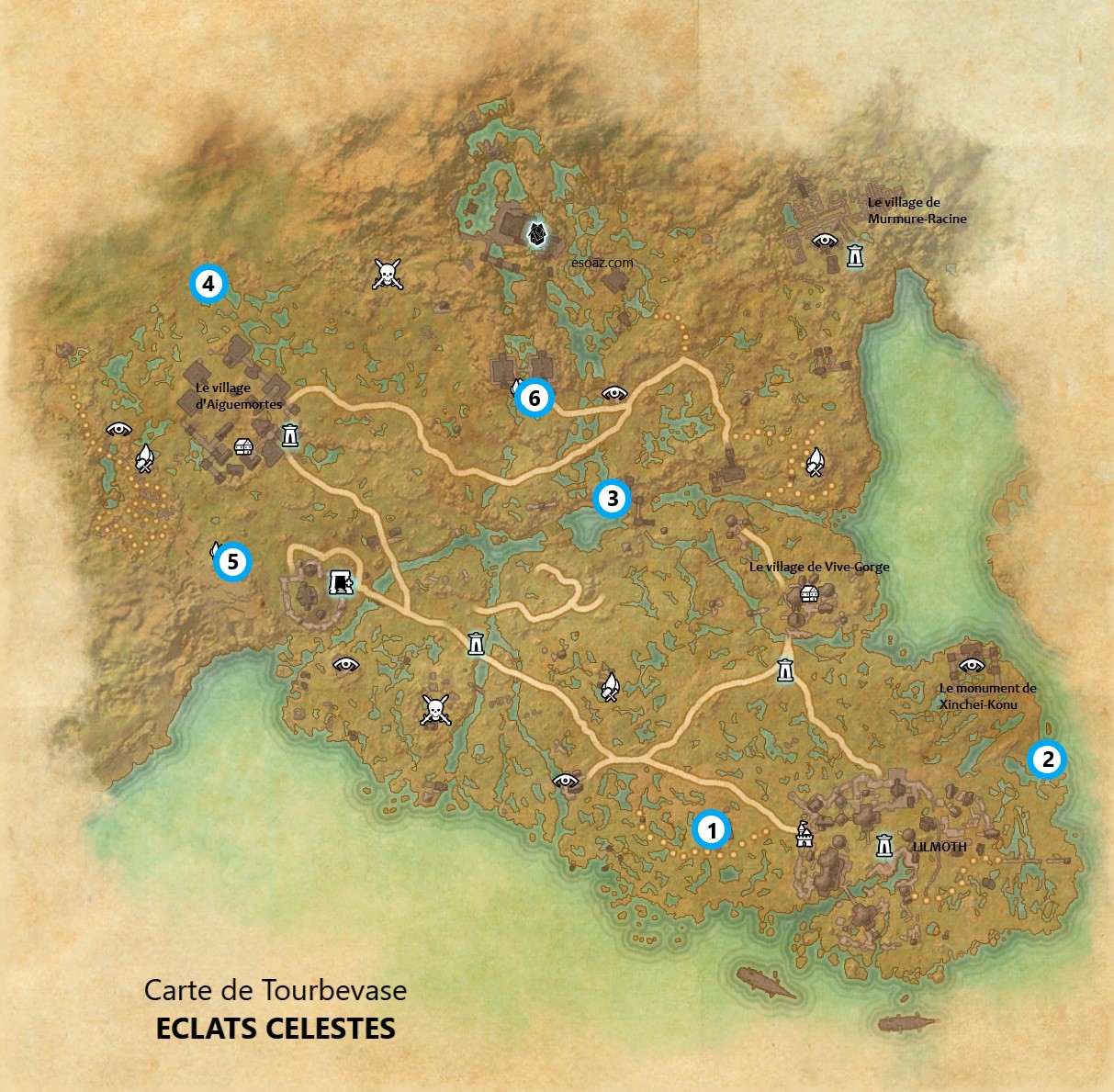 Carte de Tourbevase. Emplacements de tous les éclats célestes de la zone. Cartes au trésor et livres des mages !