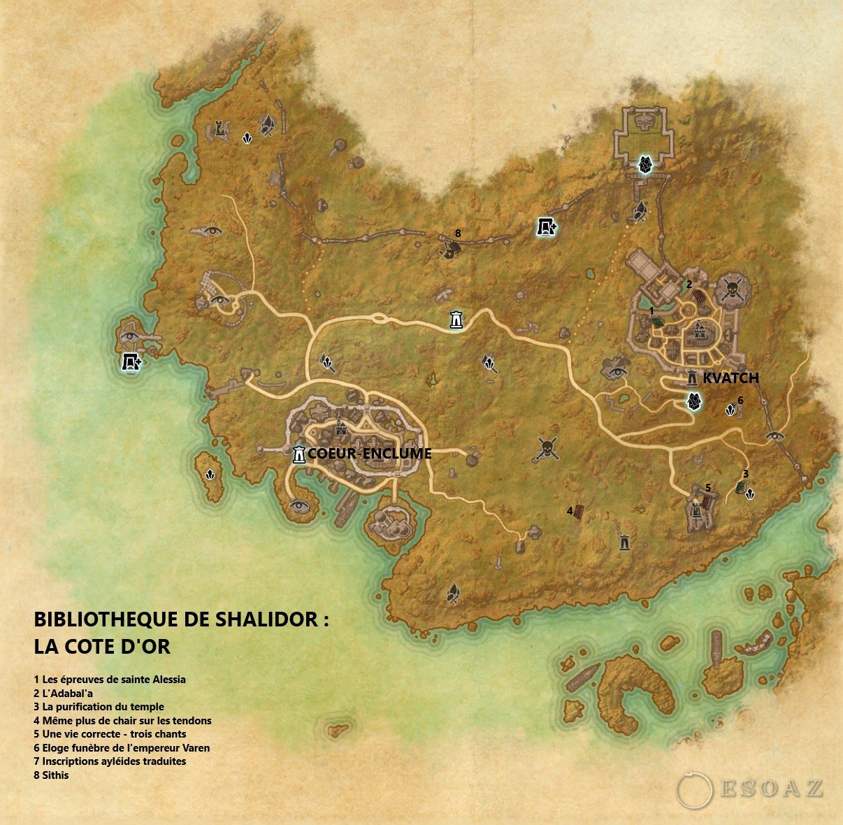 Bibliothèque de Shalidor : La côte d’or. Retrouvez tous les livres de la guilde des mages sur une grande carte numérotée !
