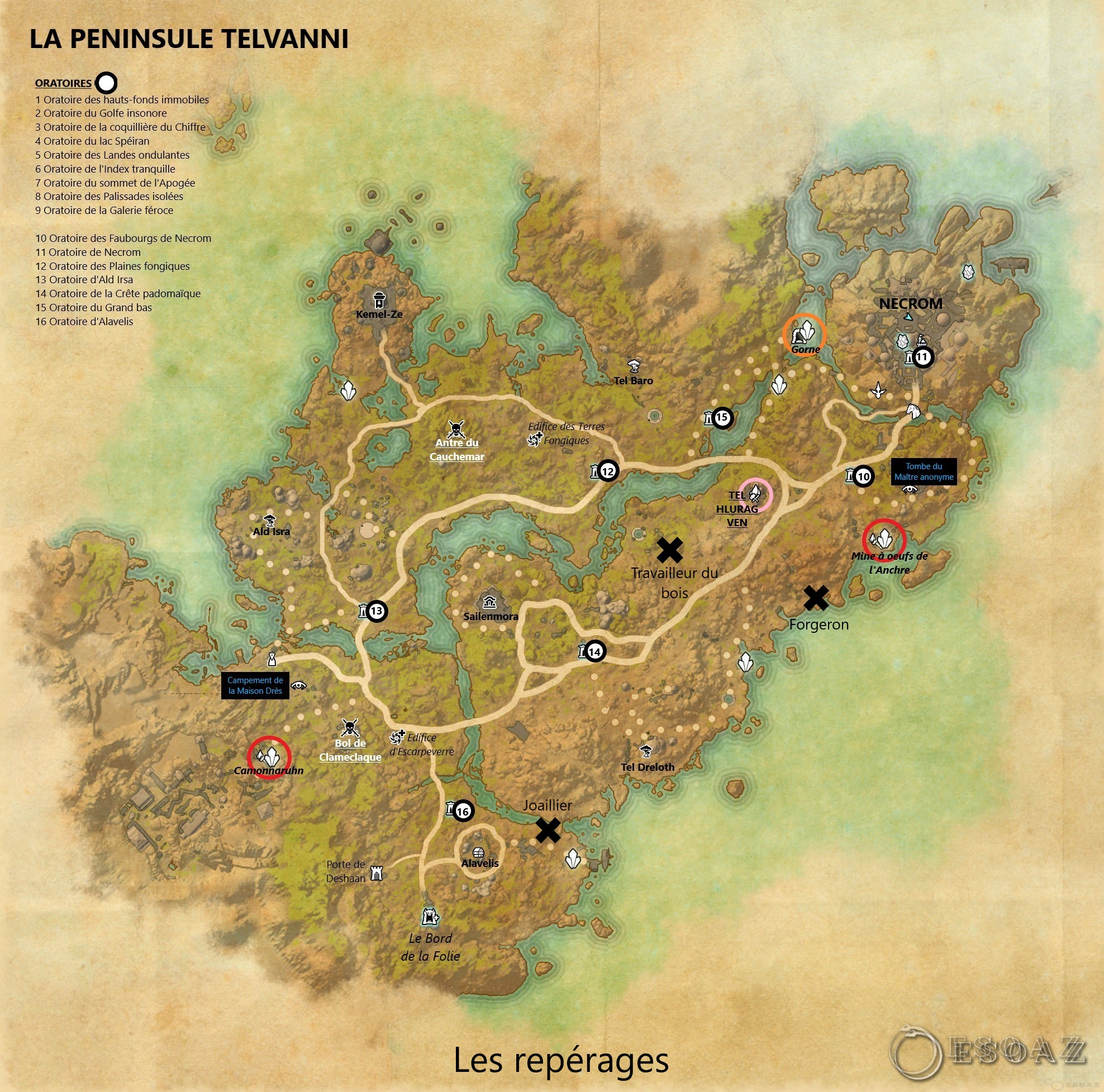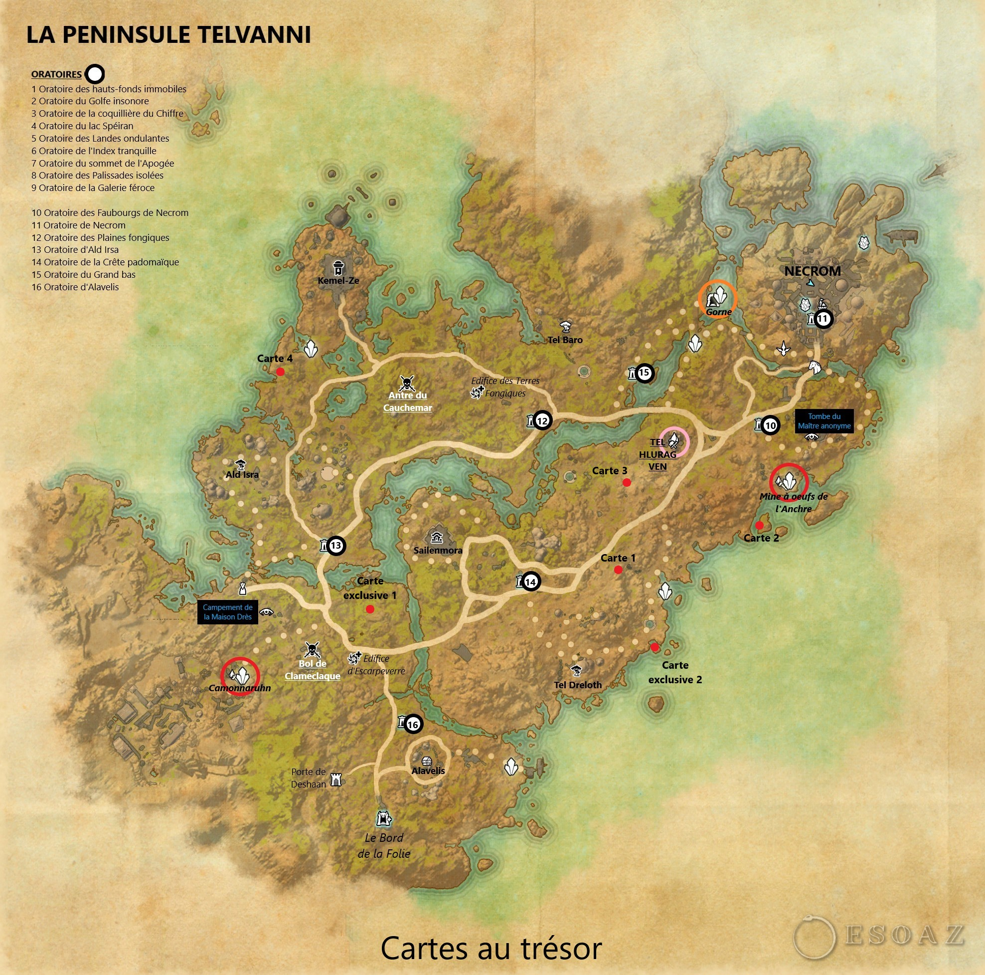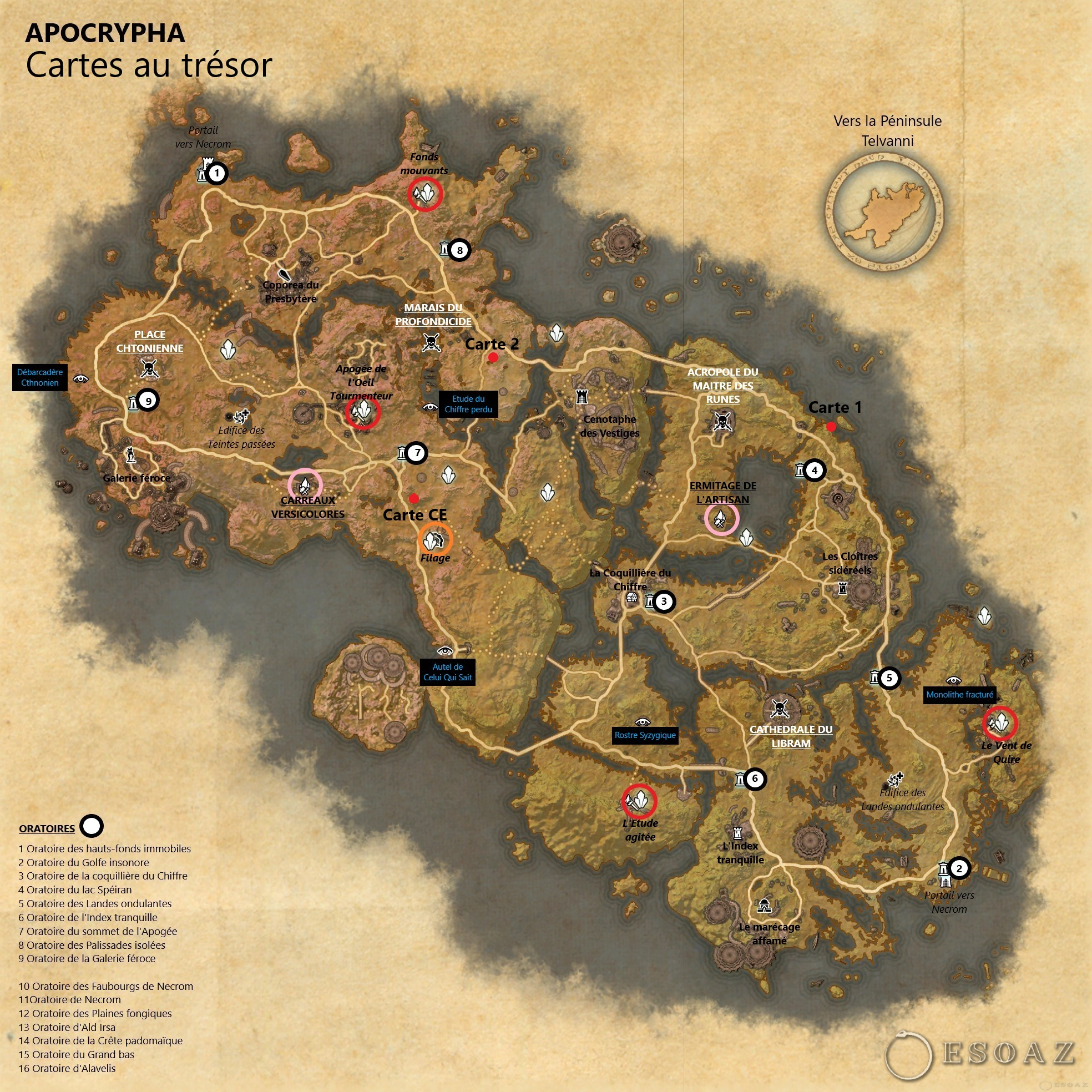 Cartes du chapitre Necrom comprenant tous les emplacements des éclats célestes de laPéninsule Telvanni et Apocrypha. Cartes au trésor et livres des mages !