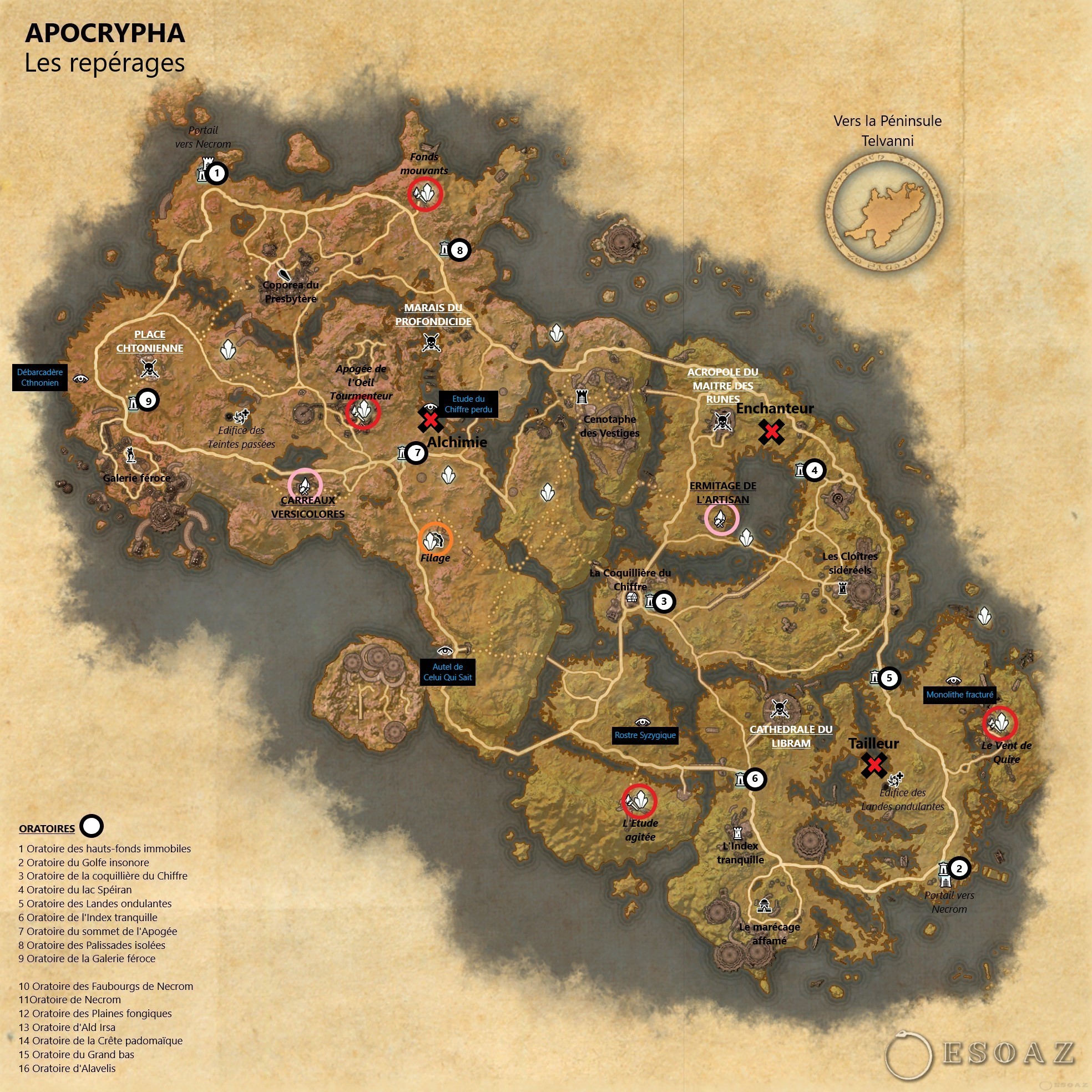 Bienvenue sur le guide des cartes de TESO pour la zone : Péninsule Telvanni & d’Apocrypha. La zone se débloque avec le Chapitre Necrom.