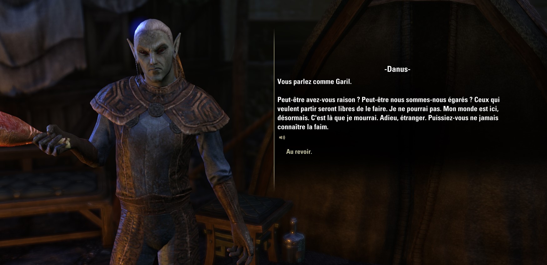 Vous pouvez aussi parler à Sil plus loin dans le camp. Il est à table et mange de la viande. Vous lui demandez ce qu’il mange : du pain de viande surprise dit-il ! L’elfe vous apprend que Garil a disparu pendant la dernière chasse …
